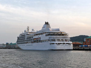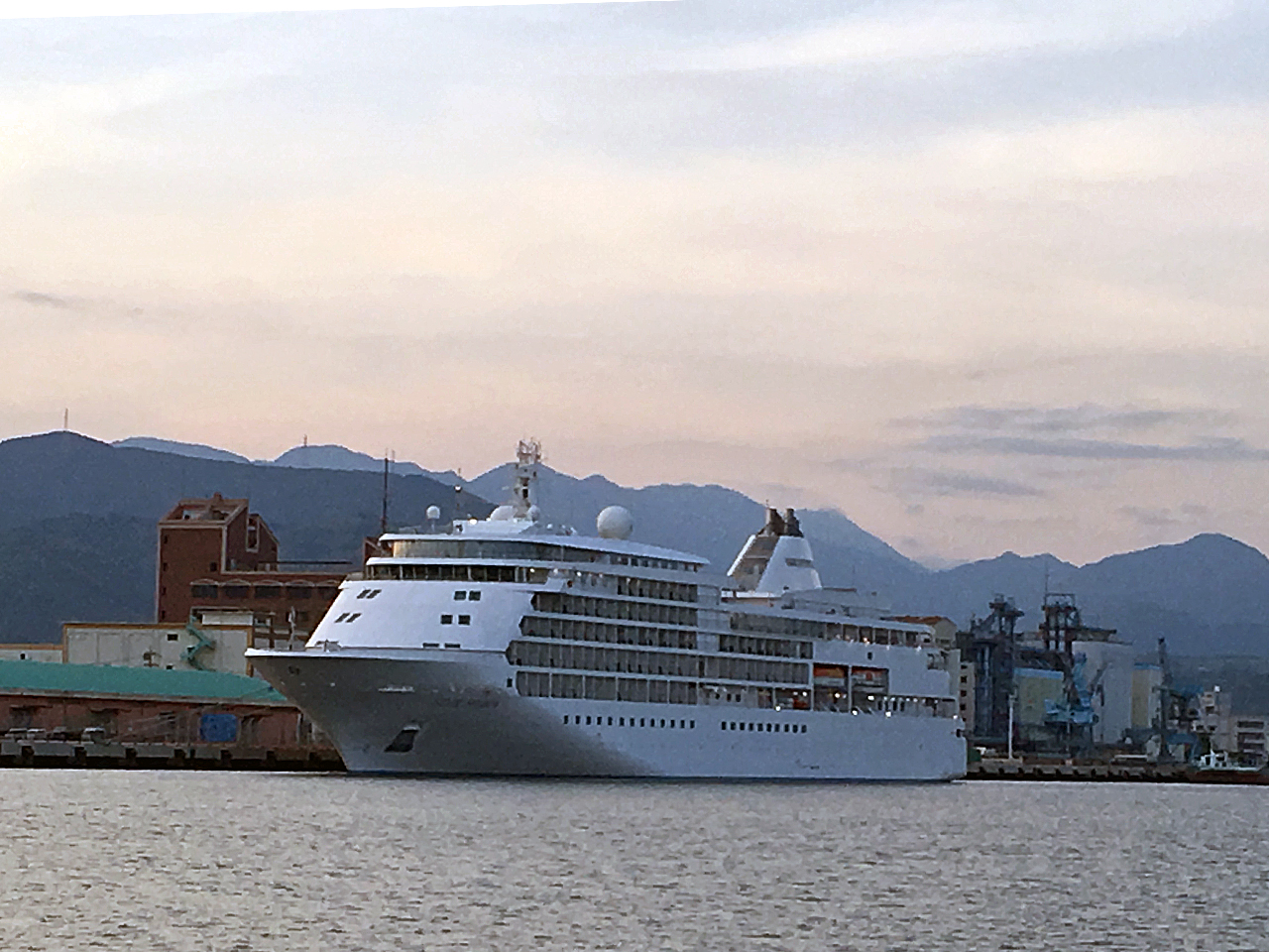 豪華客船、シルバーシャドーをドローン空撮では無く、船から撮影してみました。夕方6時ころで夕映えに映える見事なシルエットでした。