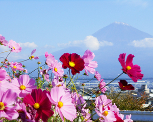 富士川の土手に約2キロにわたって咲きそろう岩本山のふもと、富士川の土手に色とりどりのコスモスが約2キロにわたって咲き誇ります。この土手はかりがね堤と呼ばれ、10月上旬に行われる「かりがね祭り」に備えて、地区の人々をはじめ市民の協力で、プランターに丹精込めて育ててきたコスモスです。雁(かり)が連なって飛ぶ形に似ていることから“かりがね堤”の名がつけられたといわれ、市民の憩いの場として人気があります。